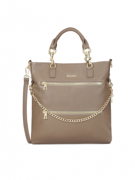 The double-sided belt, made of high-quality natural leather, combines a subtle taupe hue with deep brown, creating a sophisticated addition to any closet. The slim, elegant profile makes it ideal for wearing with a dress, gently accentuating the waist and adding class to any outfit. The gold buckle not only provides a functional clasp, but also provides a luxurious accent, perfectly matching both sides of the belt. This unique combination of colors and metallic elements makes this belt an excellent choice for those looking for a versatile but unique accessory.